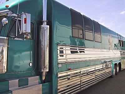 In 1996, the concept of a Class 8 Highway truck tractor married to a motorhome was an idea in the mind of Ralph Dickenson. It seemed like a logical improvement to the proliferation of underpowered square tin box RVs then on the road. His company, soon to become Kingsley Coach, built one to show at RV gatherings throughout the south. By chance, Wilbur Rimes saw the coach and was immediately sold on the concept. Rimes' 13 year old daughter, LeAnn, had just made it on the country charts and her popularity was exploding. (Google LeAnn Rimes for more info). LeAnn was about to go on tour. Rimes figured that the Kingsley coach was a refreshing alternative to the familiar bus that other groups used for travel. He wanted something different, something that said "a new kind of country star" when it rolled into town. On the spot, he ordered three of them and the Kingsley coach was a reality. The three coaches were highly customized with bunks for the crew, reception areas and in one coach a tanning booth adjacent to the master bedroom and LeAnn's dressing room.